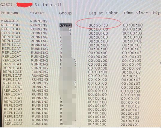 RGZ01进程延迟达将近1个小时,我们可将这几张表分离出来,另外新建一个Replicat 进程,手工重导数据后再做同步,减少一个进程处理大批量表更新操作,处理数据速度慢(由于情况比较紧急,暂时不对RGZ01进程进行拆分处理)。
