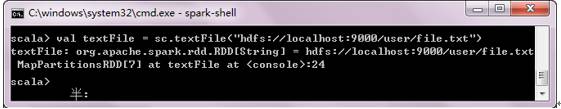 scala> val textFile =sc.textFile("hdfs://localhost:9000/user/file.txt");//val 是scala语法中声明常量的方式,sc是在进入sparkshell 时创建的sparkcontent即spark上下文,此编码是将hdfs节点上的文件读取到内存中;Sparkshell读取 HDFS 中的文件,通过 "hdfs://" 前缀指定。