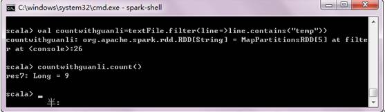 scala>valcountwithguanli=textFile.filter(line=>line.contains(“temp”))