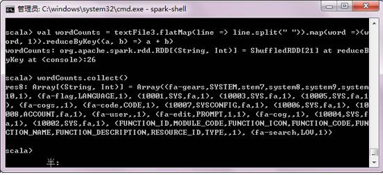 scala>valwordCounts = textFile.flatMap(line => line.split(" ")).map(word=> (word, 1)).reduceByKey((a, b) => a + b) // 实现单词统计