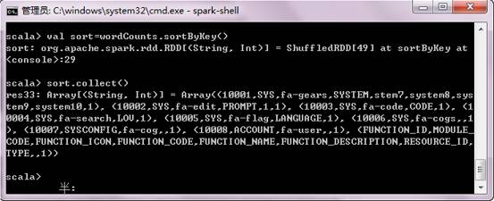 从上面可以看出,输入内容是无序的,Spark支持排序,通过sortByKey方法实现。经过排序,输出数据发生了变化。