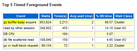 通过分析awrrpt文件,发现Top 5 Timed Foreground Events中gc buffer busyacquire排名耗时第一: