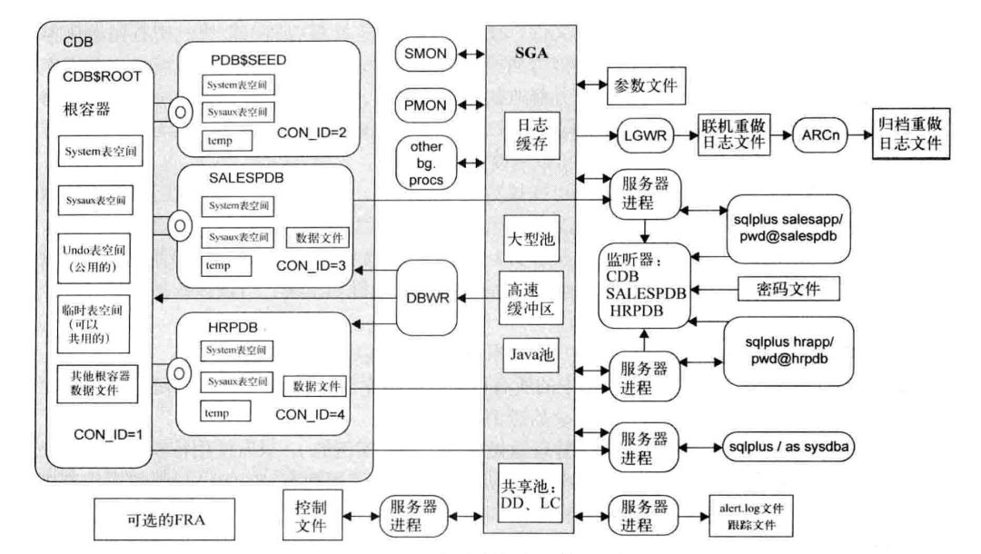 2、除了两个默认的容器(根和种子)外,上图所示的CDB还有两个可插拔数据库,它们分别为SALESPDB和HRPDB。