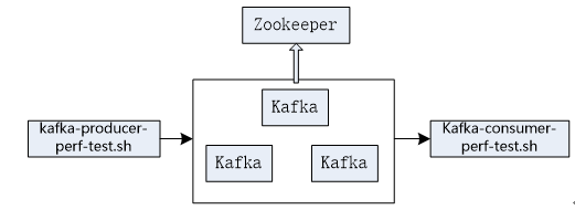 Kafka系统吞吐率受其各种参数影响,如分区Partition数量、副本Replica数量、单台broker中背景Partition数量、消息大小、消息发送/接收实例数等参数。本次使用Kafka自带测试工具Kafka-producer-perf-test.sh和Kafka-consumer-perf-test.sh向Kafka消息中间件加压,测试各种不同参数条件下Kafka系统的吞吐率。测试示意图如图3所示。