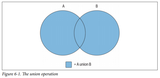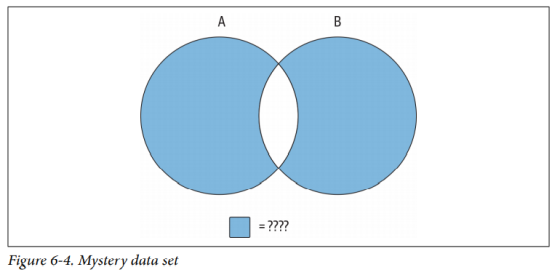 该数据集包括集合A和B非重合区域的部分。仅用一种集合操作显然是无法产生该结果的,所以你先得构建一个包含集合A与B所有元素的数据集,再使用第二种操作移除重复部分。如果使用A union B描述并集,使用A intersect B描述交集,则可以使用下面的方法生成上图(6-4)所示的数据集: