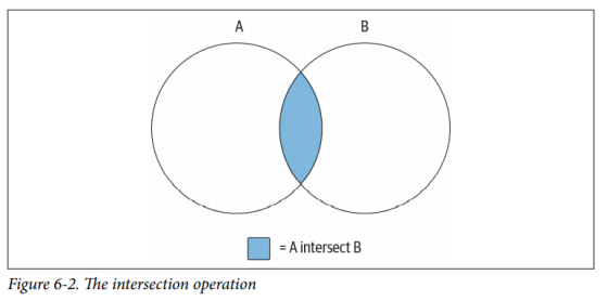 下图(6-3)显示了A except B的结果,即完整的集合A中减去它与集合B重叠的部分。如果两个集合没有重叠,则运算A except B的结果是整个集合A:
