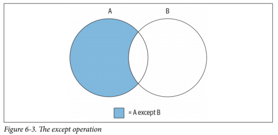 下图(6-3)所示的第三个也是最后一个集合操作称为差操作(except)。