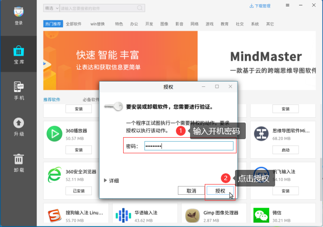 打开软件商店,我们就会看到许多软件,根据需求找到自己需要的软件点击安装(新机第一次打开会提示更新应用商店点击更新,更新完毕后就不会再出现咯,如提示输入密码,就输入开机密码-授权安装,后续安装其他软件可直接点击安装)。