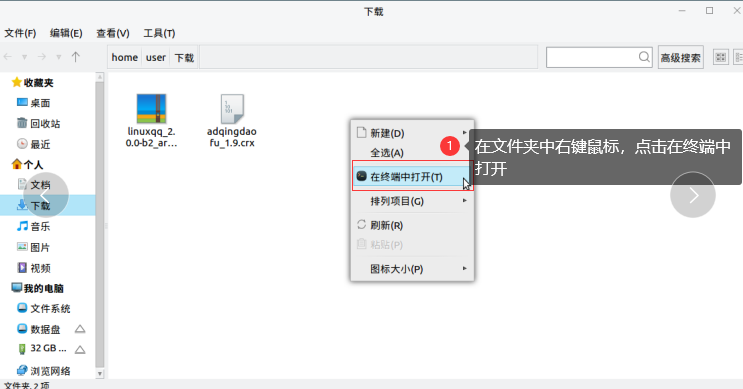 在安装包所在的文件夹中右键点击鼠标,点击在终端中打开。