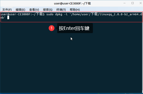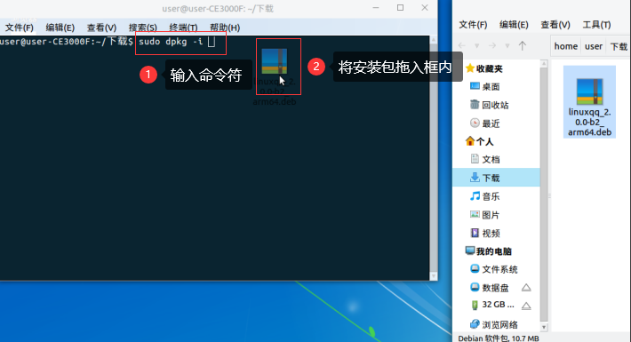 在终端界面中输入安装指令:sudo dpkg -i (注:-i后也有一个空格),之后将鼠标放在安装包上,左键按住不放拖到终端界面中。