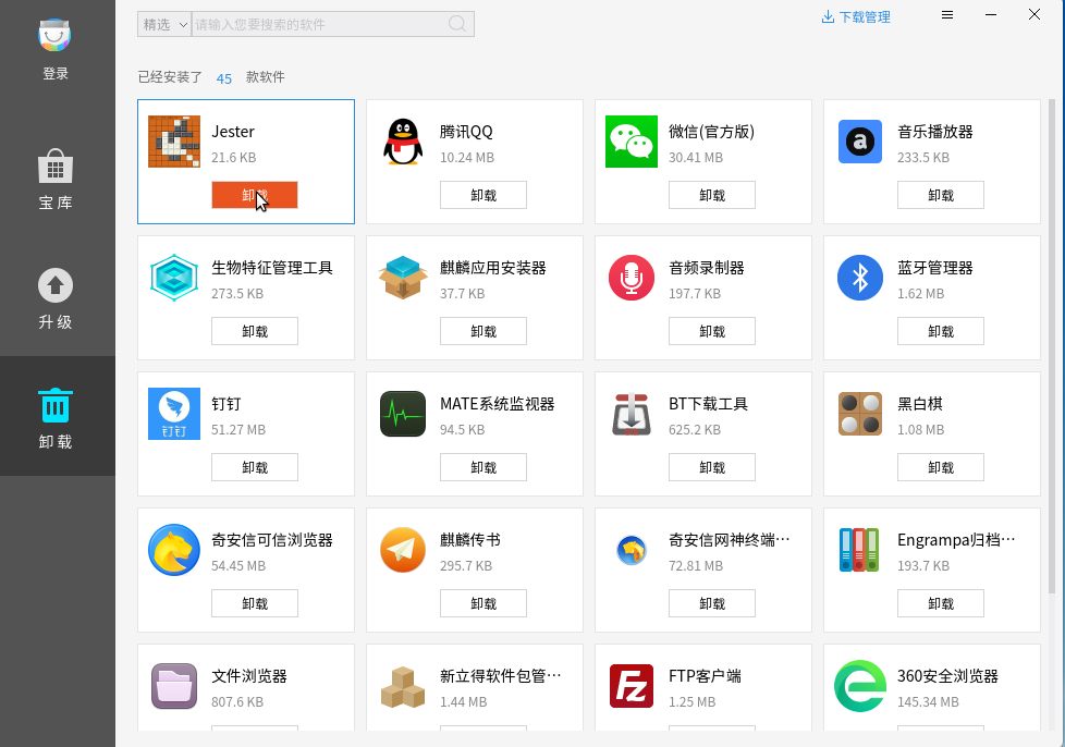 打开麒麟软件商店我们在菜单栏中可以看到有一栏是卸载,当你有不需要的软件的时候可以点击软件下方的卸载,就可以把不需要的软件进行卸载。