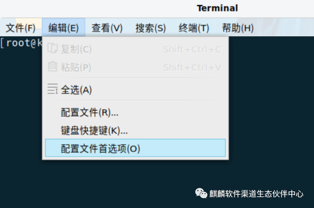 点击终端【编辑】-单击【配置文件首选项】打开终端配置窗口。