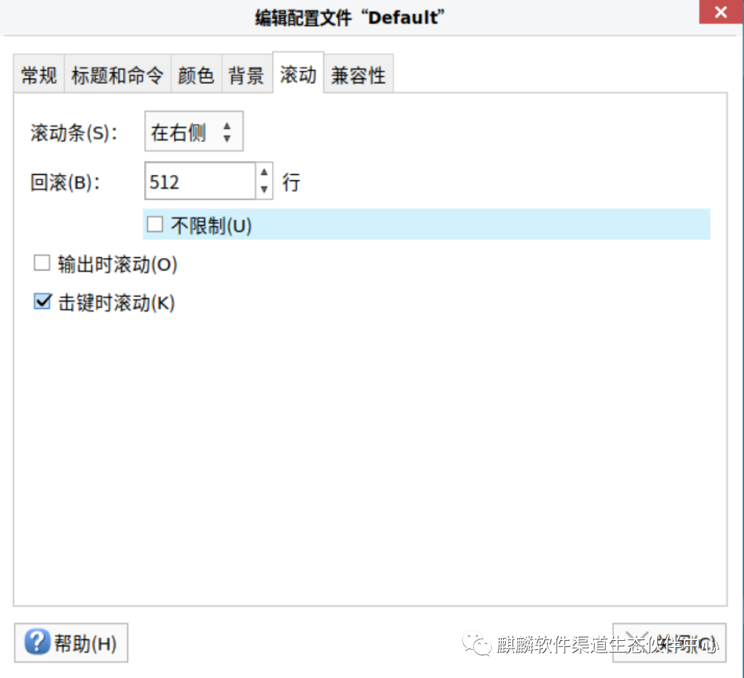 该选项卡定义了终端滚动条的位置,终端中能够回滚历史输出多少行: