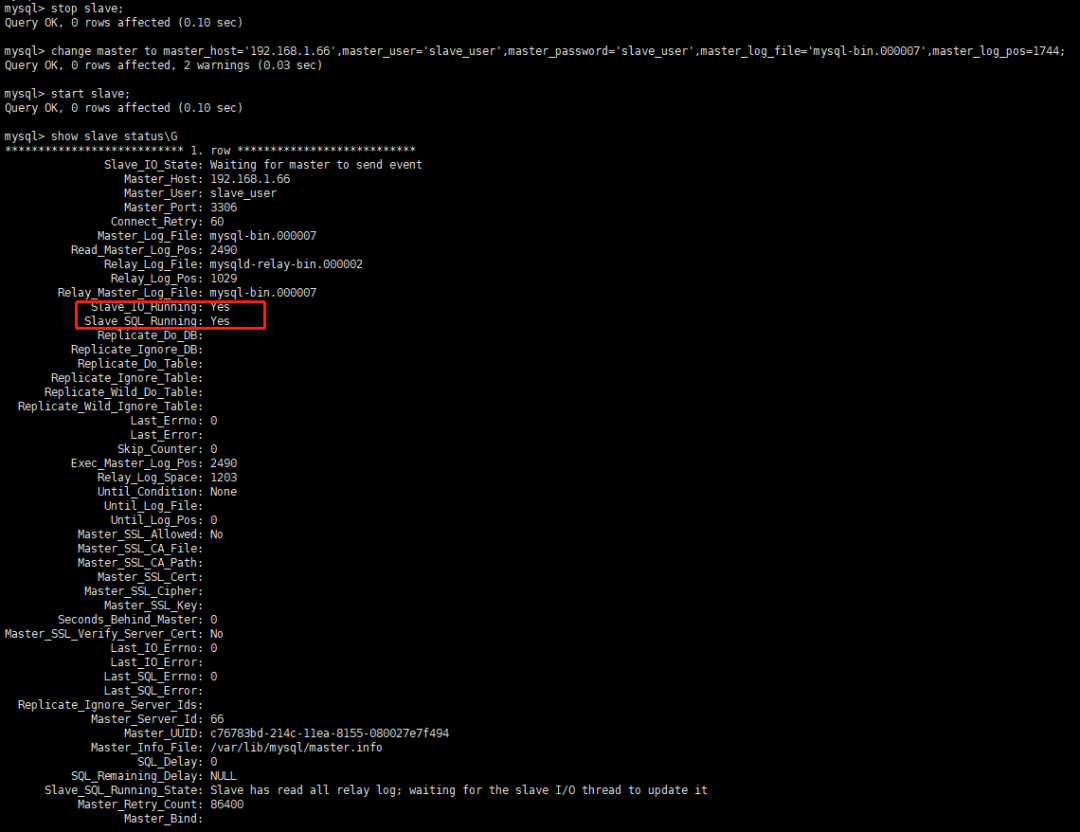 注意:master_log_file和master_log_pos是在主节点show master status得到的。