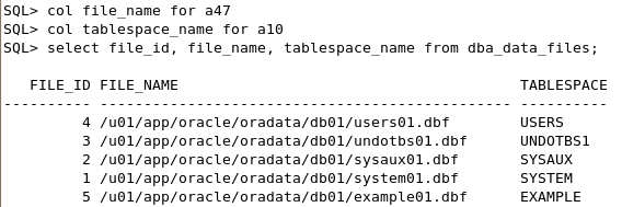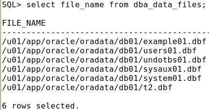 Step1:查看数据库文件的存储目录,如控制文件、数据文件和重做日志文件。此时需要使用数据字典dba_data_files,v$controlfile,v$logfile,明确需要备份的数据库文件。