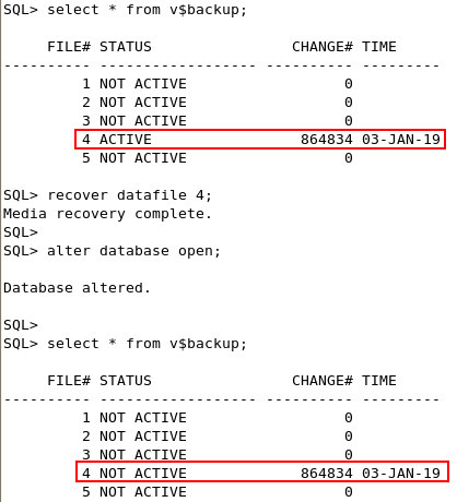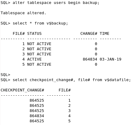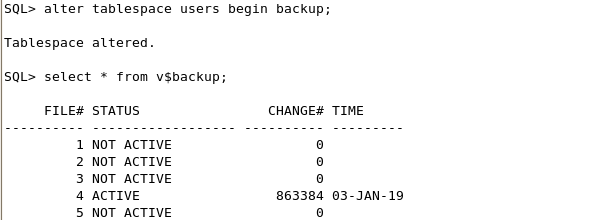 Step1:启动表空间对应的数据文件的备份模式,查看备份模式是否启动,并且观察SCN情况。