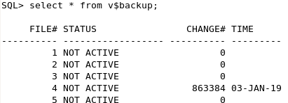Step4:查看v$backup查看文件是否已经结束了备份模式