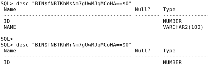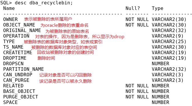 Oracle提供了数据字典user_recyclebin和dba_recyclebin供用户查询数据库中回收站的信息。