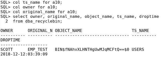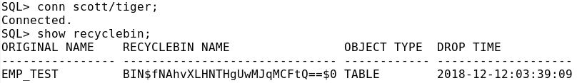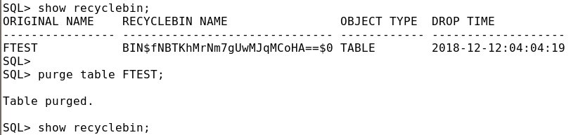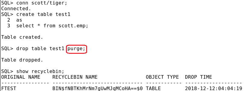 同时也可以使用purge tablespace test user scott等方式进行回收站的清空。