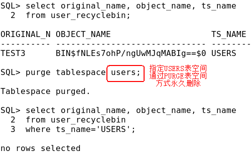 Test4:在生产数据库的维护中,有时候需要永久删除某个表空间中的多个表,可以使用如下指令直接删除和某个表空间相关的回收站中的表。