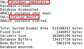 停止Oracle Server并装载数据库(数据库处于MOUNT状态下才能修改日志操作模式,所以必须停止Oracle Server,然后装载数据库。关闭时不能使用ABORT。)