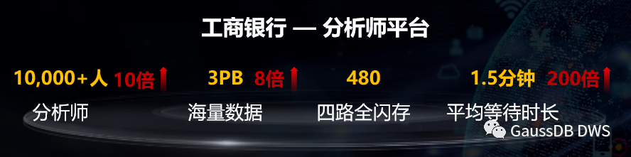自2015年,工商银行启动新一代数据仓库的建设,解决日益增长的数据和业务需求,截止目前已建成8套集群、1000多个节点。基于华为云GaussDB(DWS)的分析师平台,单集群480节点四路全闪存服务器是全球最大金融数仓。承载13000位分析师在线数据探索,其作业平均等待时间从原来300分钟将至1.5分钟,灵活查询平均执行时间从30分钟将至50秒,大幅提升分析师体验,真正实现了人人都能成为分析师。
