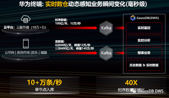 华为云GaussDB(DWS)实时数仓已在华为云终端实时智能监控平台投产使用。该平台承载运维部门的业务监控,云平台10万多台服务器和数亿台智能终端持续上传时序数据和流数据,经过复杂分析处理后展示在前端监控台。时序数据单机入库每秒10万条、流数据每秒60万条持续入库,时序、流数据实时入仓持续计算,解决了时序数据和流数据在传统数仓的“装不进”问题。