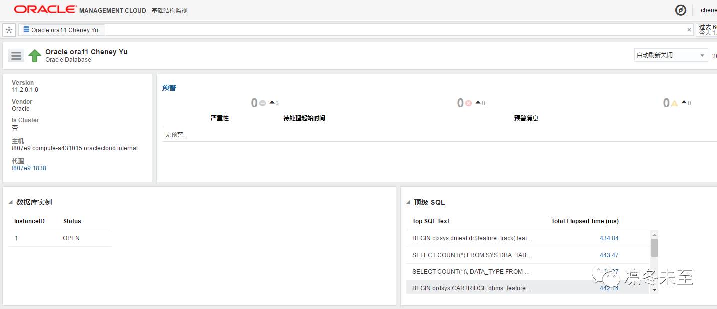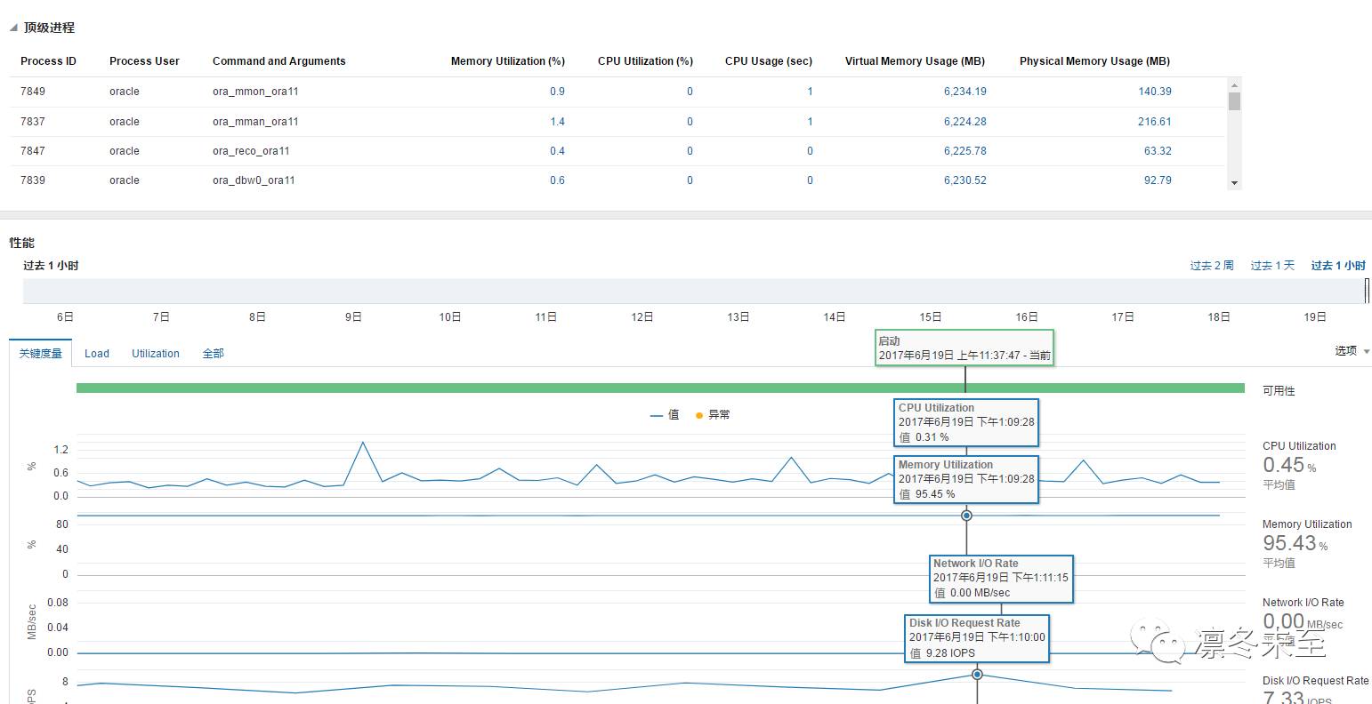 点击实体“Oracle ora11 Cheney Yu”,进入数据库实体的监控界面,就能看到这个数据库的相关运行数据:
