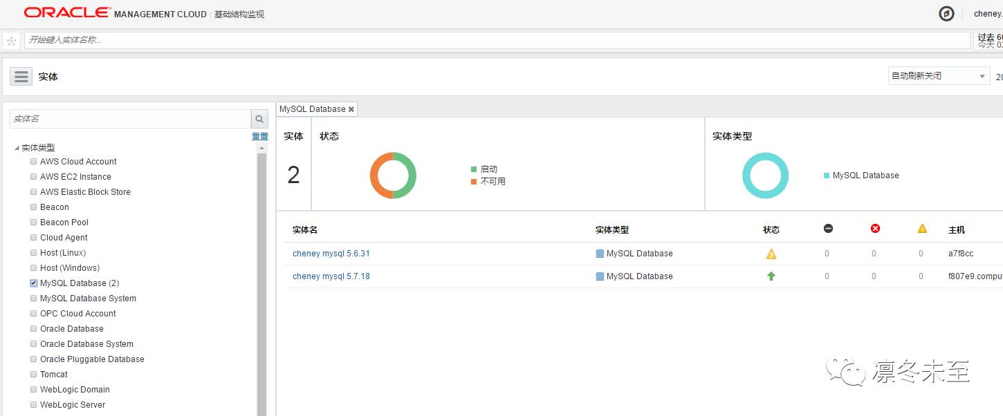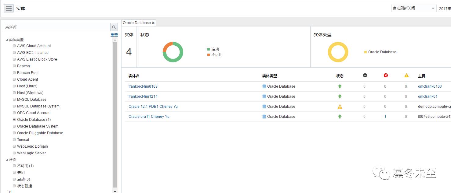 登录基础架构监视云主界面,进入“实体”,在“实体类型”中选中“Oracle Database”,就能看到刚刚加入监控的Oracle数据库的实体,
