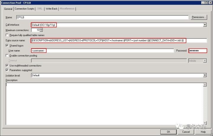 在连接池对话框界面,用Oracle云上的数据库云的配置信息,修改“数据源名 Data source name”、“用户名 User name”和“口令Password”,在“调用接口 Call interface”处选择“Default (OCI 10g/11g)”,备注:目前只支持将本地环境中的Oracle数据库(OCI接口)上传到Oracle BI云服务(因为Oracle BI云服务后端连接的是Oracle数据库云服务,所以目前只支持将连接Oracle数据库的数据库模型,上传到Oracle BI云服务上),点击OK: