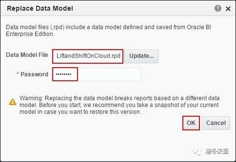 在弹出的“替换数据模型”(Replace Data Model )窗口,选择上一步保存好的本地数据模型备份,并输入数据模型的口令,点击OK:
