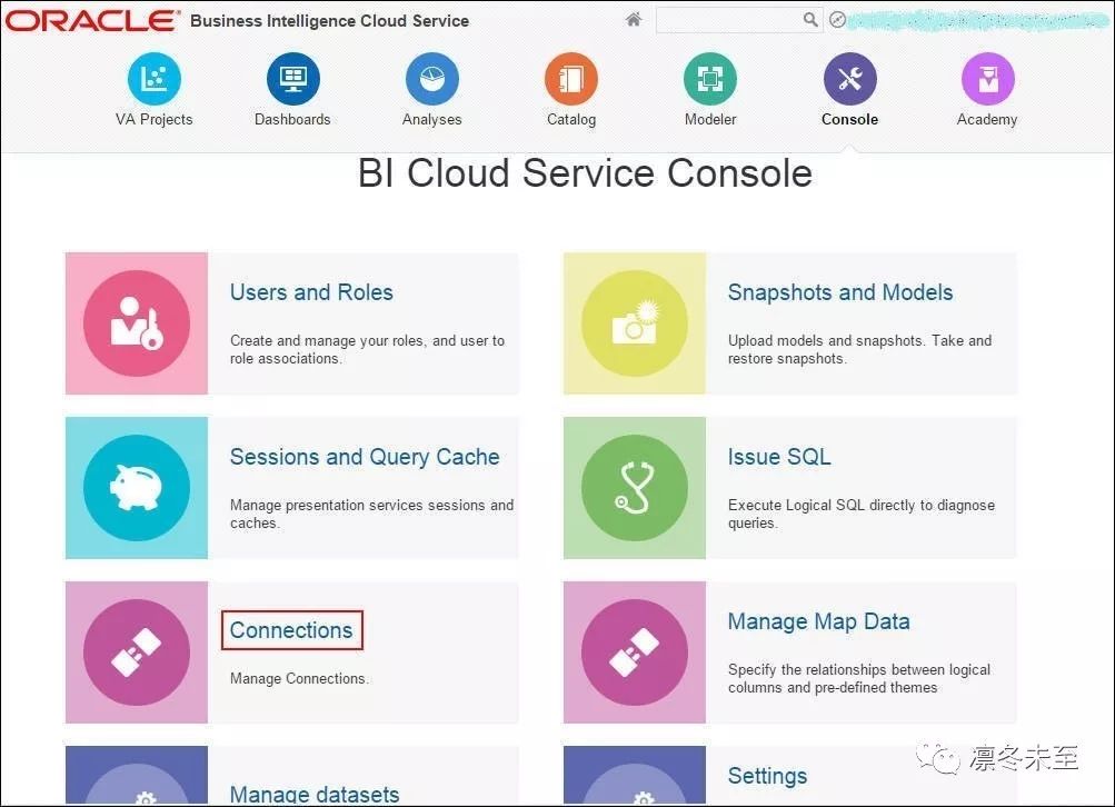 在BI 云服务控制台界面,点击“连接”(Connections)图标: