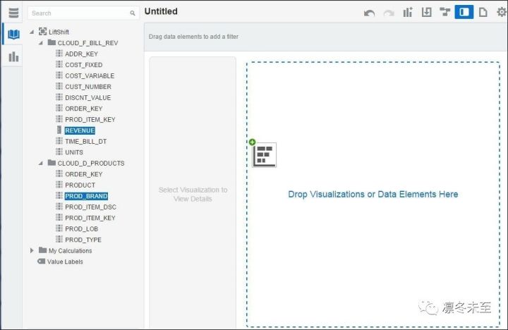 在数据元素面板中,选中数据元素,如本例中,用Ctrl键同时选中两个数据元素(PROD_BRAND 和REVENUE),拖拽到右边的画布中: