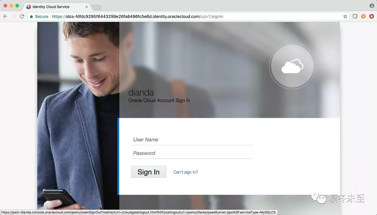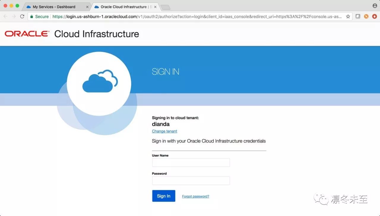 在OCI界面中输入Tenant名称、用户和口令,如图: