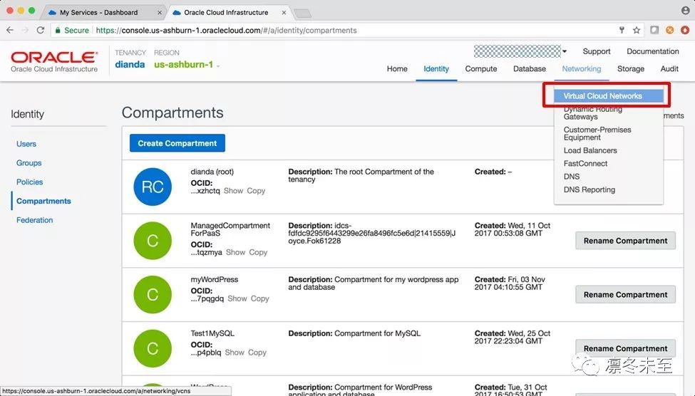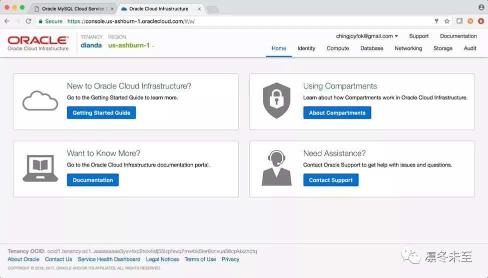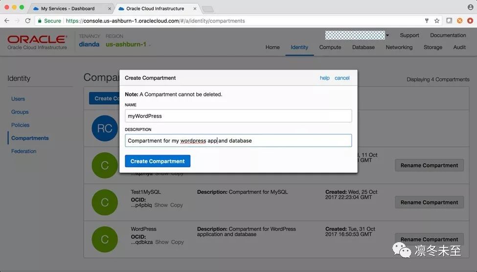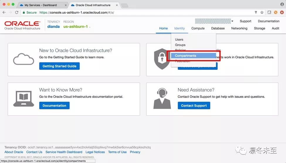 OCI与OCI-Classic不同,当用户第一次登录OCI账号时,在创建其他服务前,需要先创建一个Compartment。