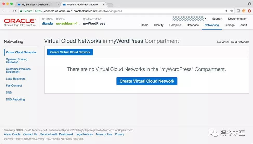 Compartment创建好后,接下来就是创建VCN和子网了。在OCI的主界面,点击”Network”,选择“Virtual CloudNetwork”,进入VCN界面,如图: