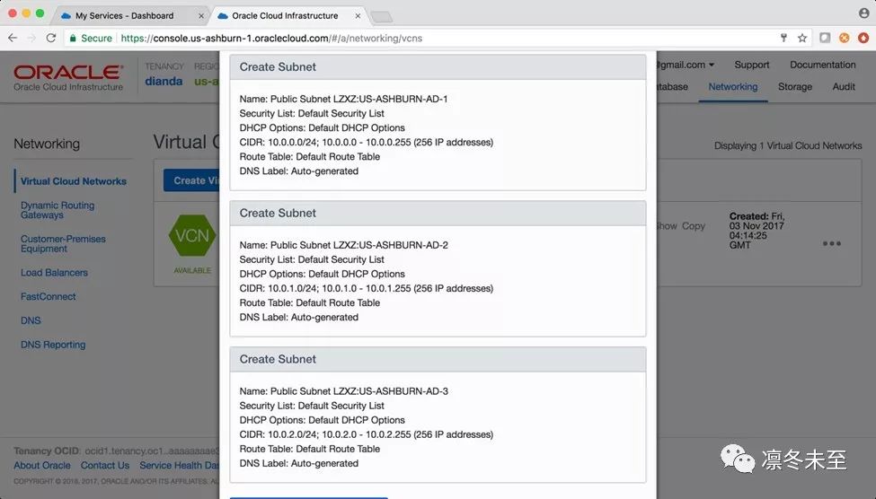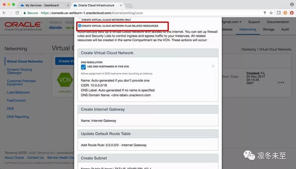 本例中,我们选择第二项“Create virtual cloudnetwork plus related resources”, 系统在创建VCN的同时,会自动创建Internet Gateway、DefaultRoute Tables,同时会在Region中的每个可用域(即Availability Domain,简称AD)单独创建一个子网(Subnet),并为每个子网设置路由表,如图: