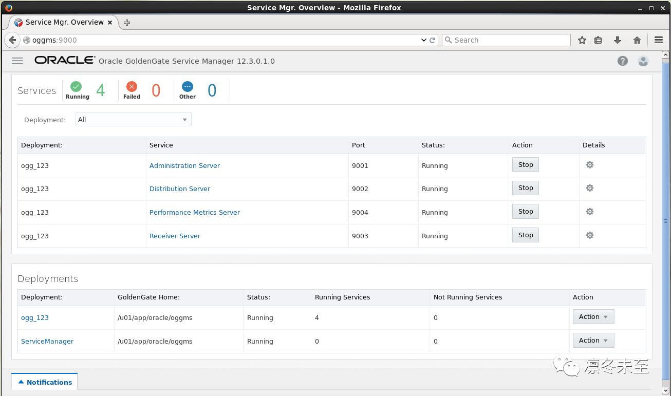以下是OGG微服务的Service Manager管理页面,您可以看到与之关联的OGG部署,服务类别,端口号,运行状态等。