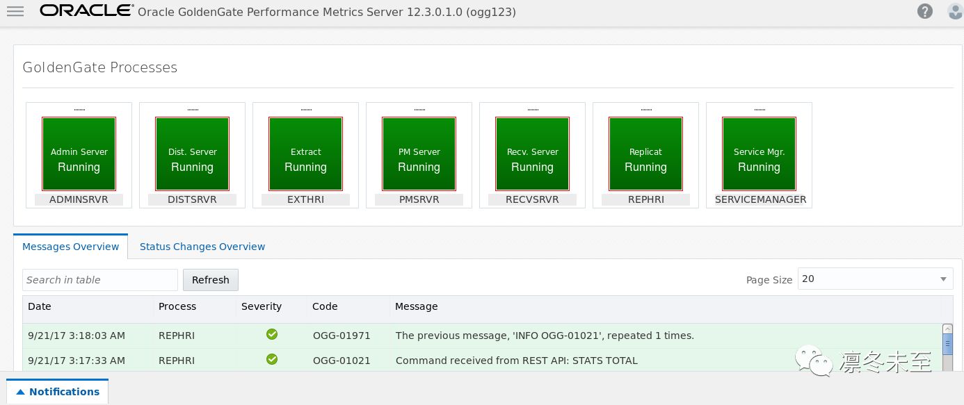 PerformanceMetrics Server: Performance Metrics Server是MA提供的实时性能监控服务。它可以通过网页展示各个服务和OGG进程的消息总览和状态变化总览。我们还可以通过点击进程来向下钻取来查看详细信息如:进程,线程性能指标,trail 文件,数据库,缓存,队列统计信息等。