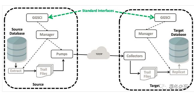 在GoldenGate的传统系统架构中,GoldenGate的设置、管理工作都是通过GoldenGate的命令行接口(GGSCI)来完成的。GoldenGate需要部署在执行数据复制的数据库服务器上,我们通过部署在本地的GoldenGate的GGSCI命令行接口完成我们和本地部署的GoldenGate的交互。比如增加、管理GoldenGate的管理进程、数据抽取进程、数据泵进程、数据投递进程等。在这个传统的架构中数据通过TCP/IP网络在源端和目标端完成数据的复制和同步。整体架构采用低耦合的软件价格,所以GoldenGate可以用于多种场景,实现多种数据复制和同步的拓扑,比如:一对一、一对多、多对一、双向等复制架构。