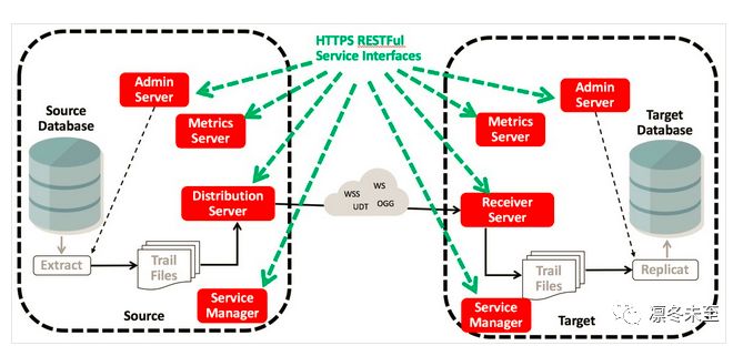 尽管GoldenGate的传统架构已经被大家所熟知,但是面对现在新技术和新需求的挑战,Oracle也在不断地探索,经过不断的发展和努力终于推出了GoldenGate新的基于微服务体系架构的新的软件系统。新的体现架构可以基于标准的“RESTfulAPI”方法来构建,这是在数据复制领域的一次新的飞跃。这彻底打破了在GoldenGate的管理、访问、使用上的限制,让GoldenGate可以有更广泛的应用场景。用户可以通过标准的API来控制和访问GoldenGate。下图是GoldenGate新的基于微服务的系统架构图。