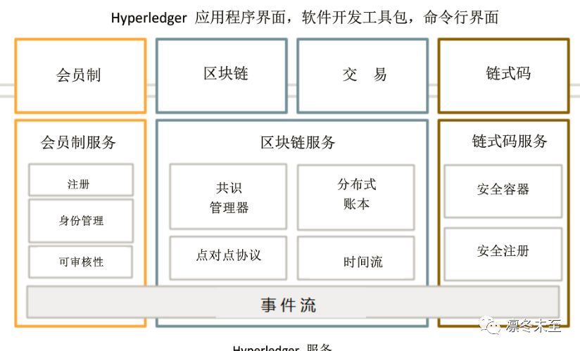 超级账本包括三大组件:区块链(Blockchain)、链码(Chaincode)、成员权限管理(Membership)。