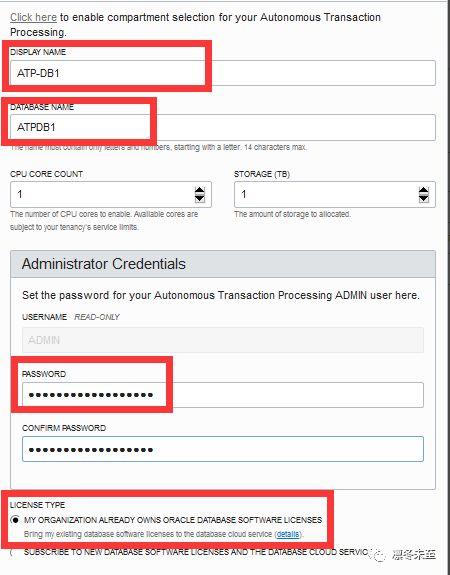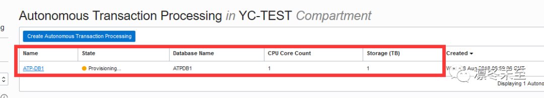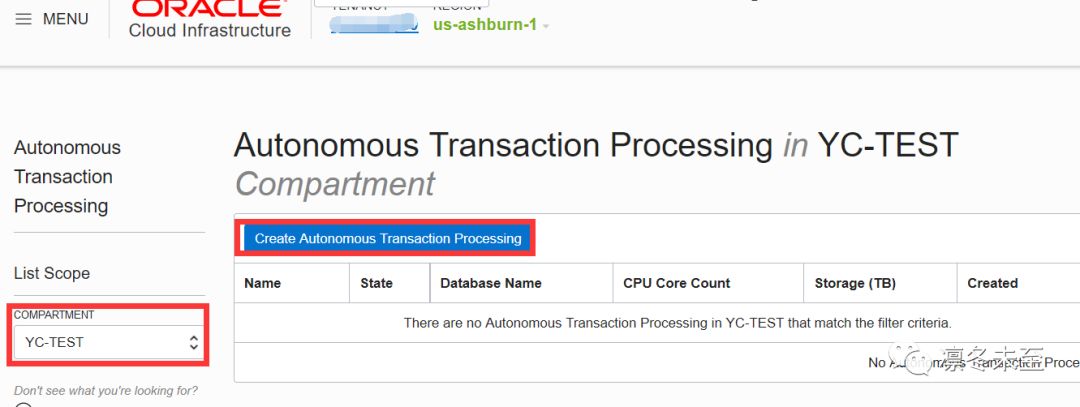 在创建ATP实例前,先要创建一个COMPARtMENT,一个新账号会缺省创建2个COMPARtMENT,这都是给系统自用的,有点像system表空间一样,强烈建议新创建一个COMPARtMENT来存放各种新建的服务。在我的账号中刚好已经创建了一个名为YC-TEST的COMPARtMENT,所以我们可以从左侧的COMPARTMENT下拉框中选择YC-TEST,然后点击按钮“Create Autonomous TransationProcessing”,开始创建ATP实例。