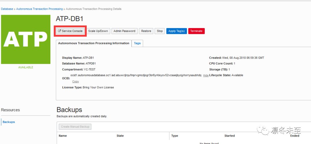 几分钟后,ATP实例创建成功!下面是创建好的ATP实例界面,我们可以点击“ServiceConsole”界面进入ATP数据库的控制台,第一时间感受一下ATP。