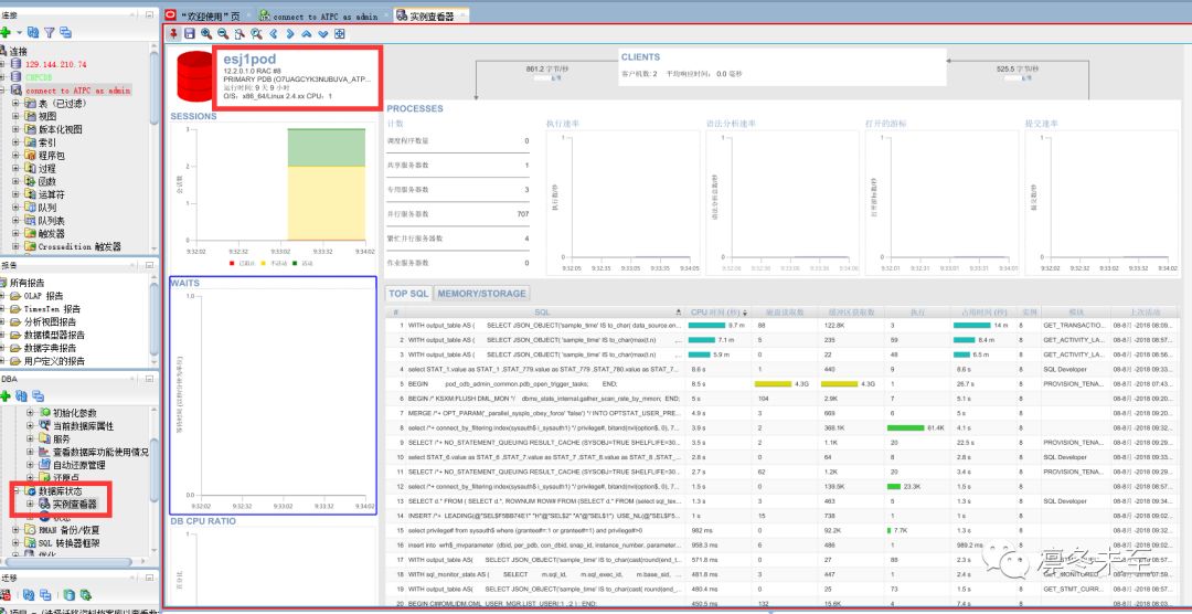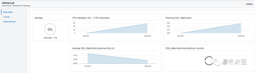 查看ATP实例的概率:存储空间使用情况、CPU的使用情况、SQL的运行情况等。