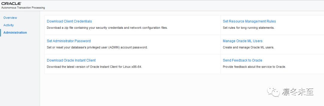 点击“Adminitration”,可以做一些管理工作,如:下载客户端信任文件、设置管理员口令等。其中下载客户端信任文件的工作很重要,因为客户端连接ATP数据库时,必须采用这个客户端信任文件。