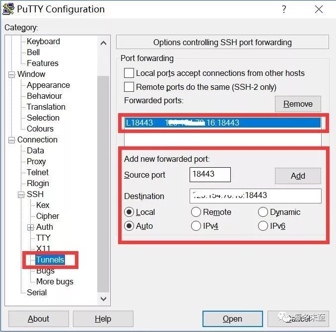 然后点击添加,在“Forwarded Ports”区域就能看到刚刚添加的记录(L18443)。 点击“Open”,建立一个Putty会话。