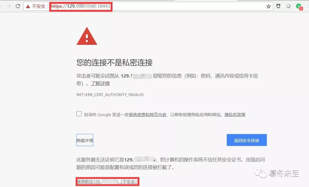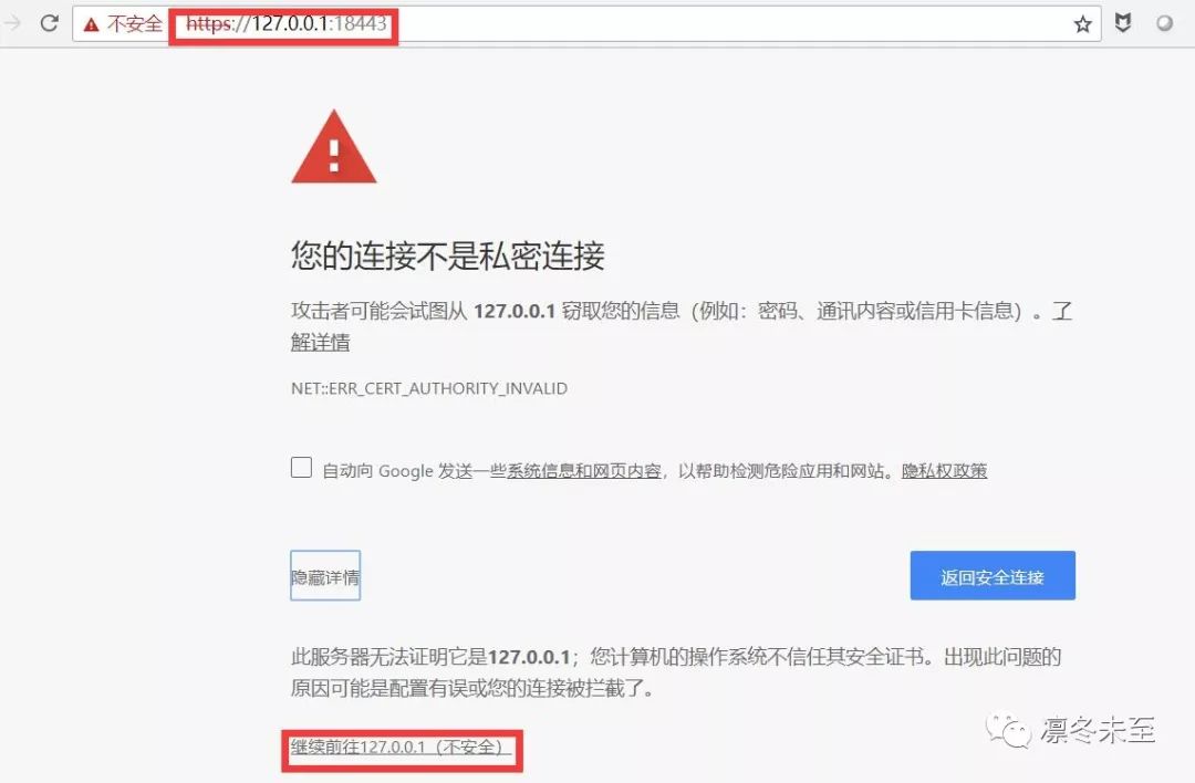 系统会提示信息:“您的连接不是私密连接”,点击**“高级”,然后点击“继续前往127.0.0.1(不安全)”**。