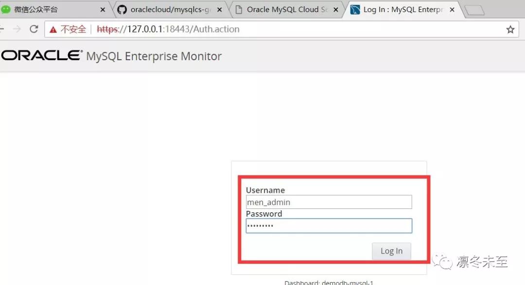 进入MySQL 企业监控器(MySQL Enterprise Monitor)登录界面,输入用户名和口令,注:在创建MySQL实例时,我们已经设置了用户名和口令。