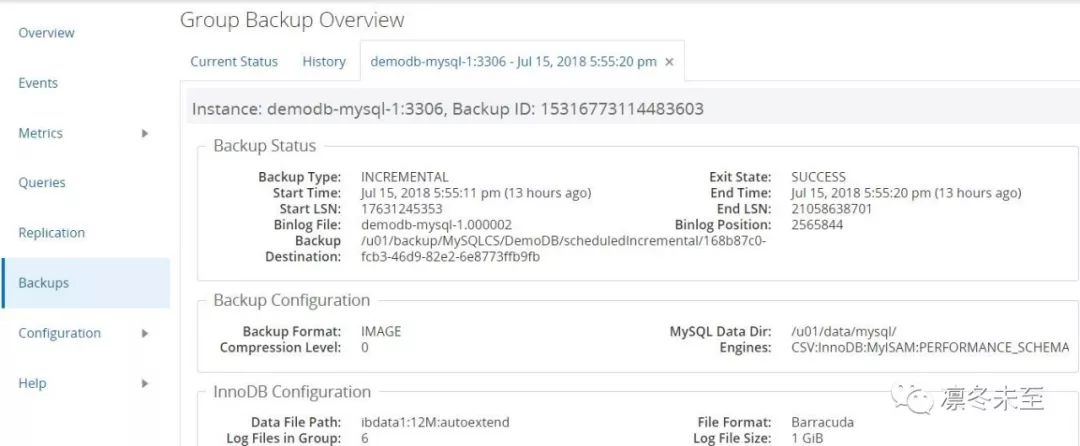 比如我们要查看前面步骤中的备份状态信息,点击左侧的“Backups”,就能看到所有备份的信息,如图: